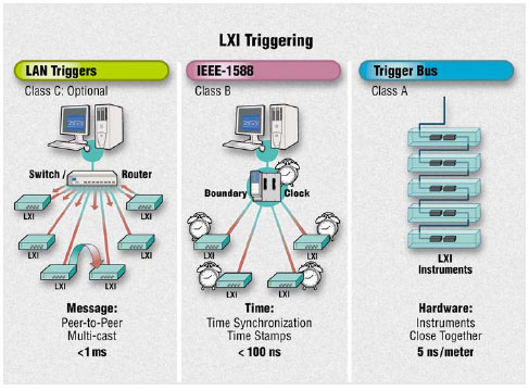 LXI Device ClassesClass C is the basic Class. Class B devices have additional capabilities for LAN triggering and synchronization support. Class A satisfies the requirements of Classes C and B with the addition of a hardware synchronization bus with low transmission latency (this bus provides the highest possible response time to a trigger event) [17].